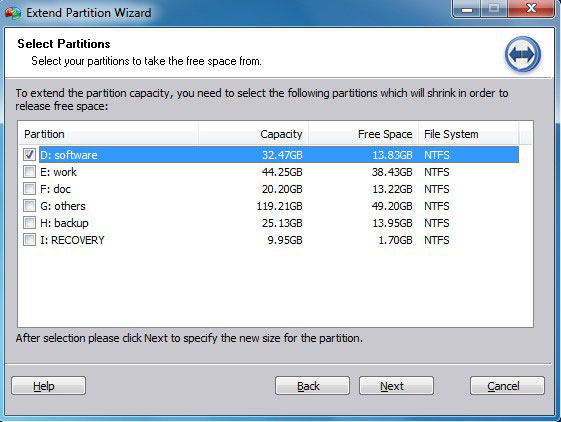 Extend partition without Automatical Mode In this mode, you need to select one or more partitions to take space from. Drag the bargraph rightwards, the system partition will be extended by shrinking the partition(s) you selected. |