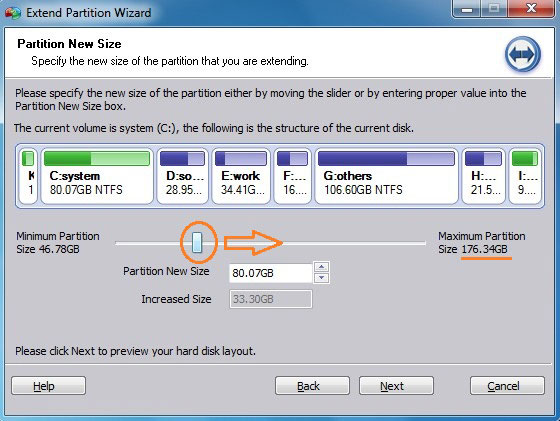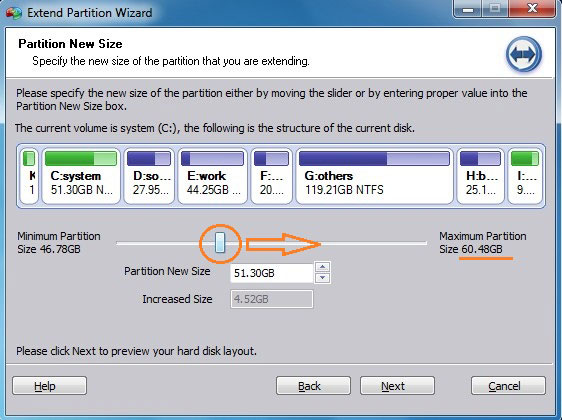 Extend partition with Automatical Mode In this mode, you don't need to select partitions manually, all partitions will be shrank to release free space. Drag the bargraph rightwards, the system partition will be extended by shrinking all other partitions automatically. |